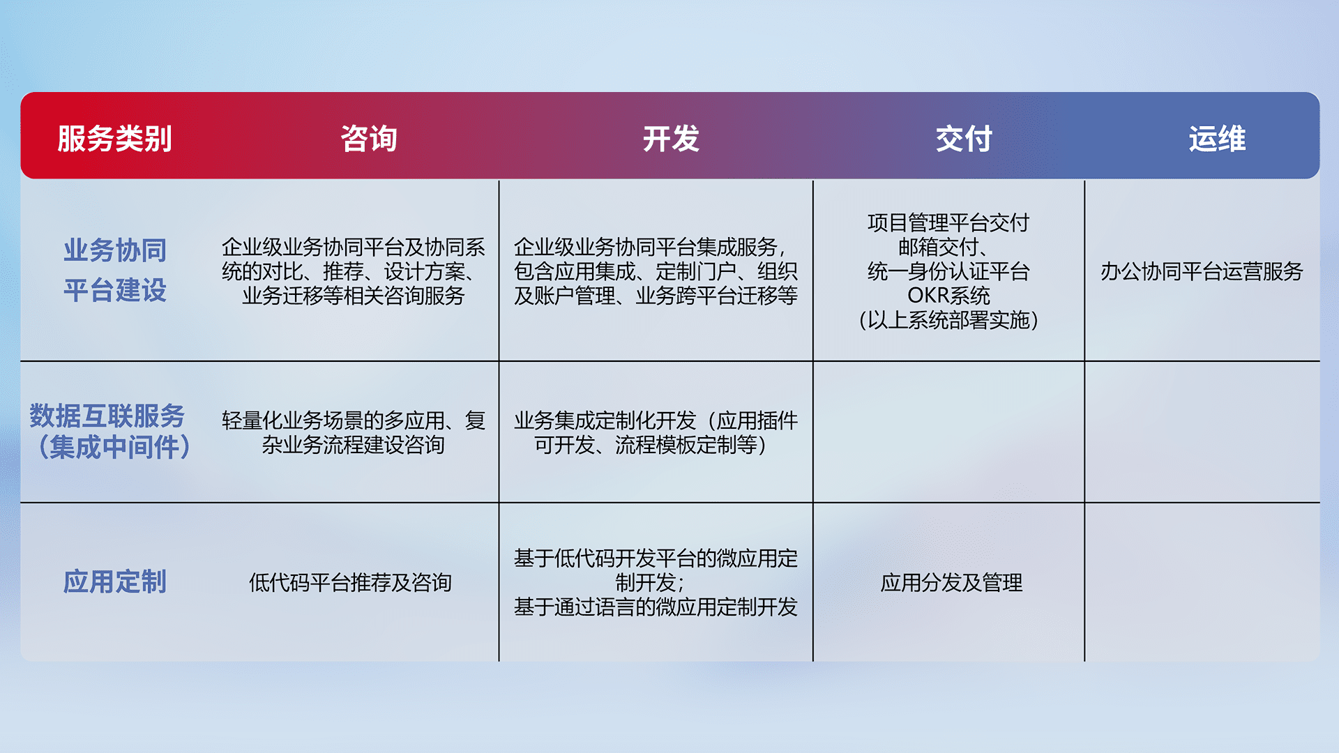 针对钉钉、、、企微、、、IDaas等平台级产品提供产品的规划、、方案、、交付、、定制化开发等服务,,,,实现如统一协同办公、、、智能客户服务、、、、混合会议管理、、智能数据查询、、等业务场景,,,实现数字化转型。。。。