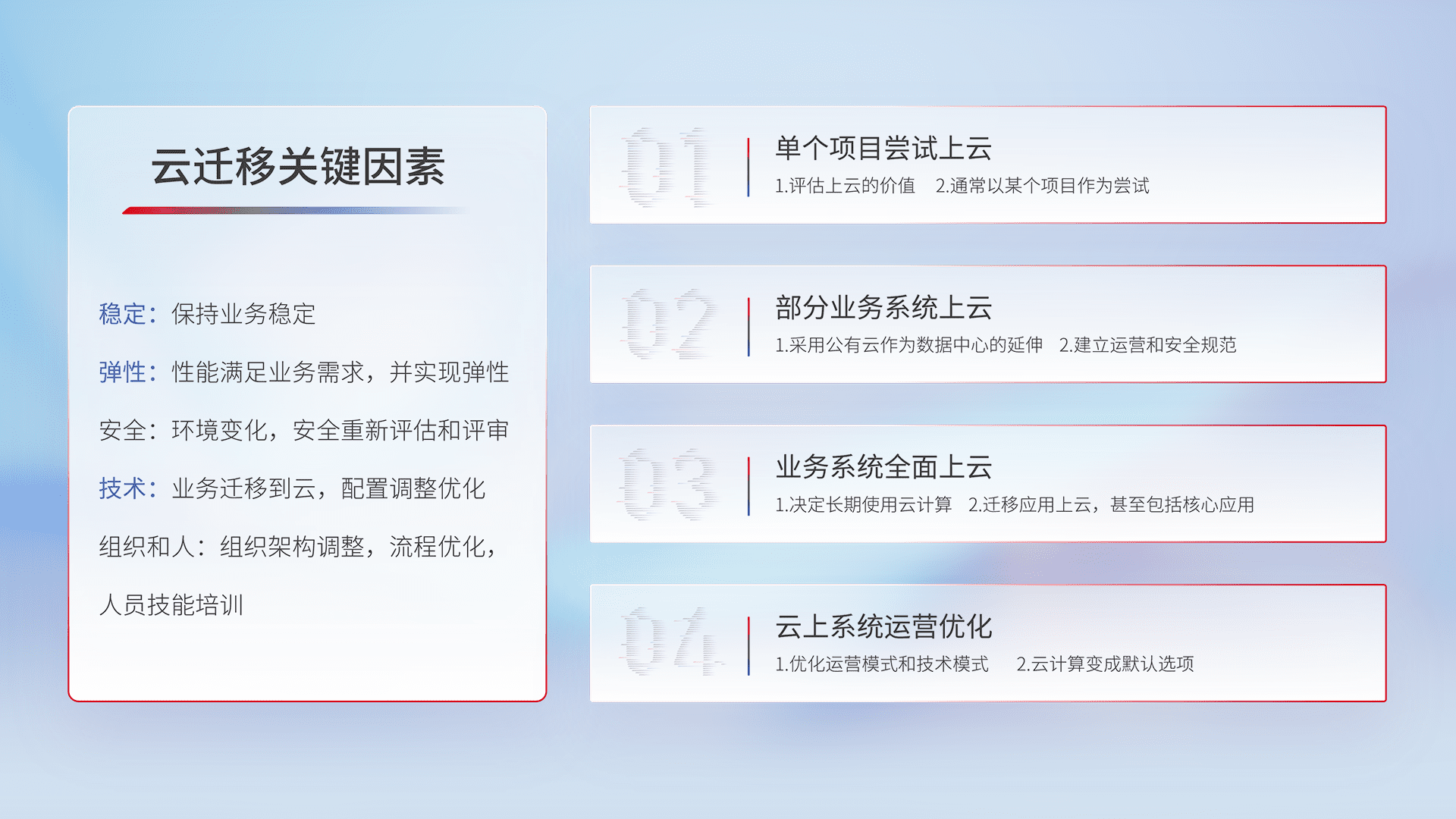 结合实际业务,,,从规划设计、、云平台选型、、云原生改造、、数据迁移、、集成交付,,,,迁移全过程为客户识别最佳上云路径,,,,做好风险识别管理,,,,设计网络架构、、、身份权限、、、安全审计合规、、操作审计、、、、日志审计、、监控告警策略、、、、多站点容灾设计等,,,,对云上基础设施进行整体规划,,,,提升IT治理水平,,,以满足弹性、、高可用、、、高性能的需求。。