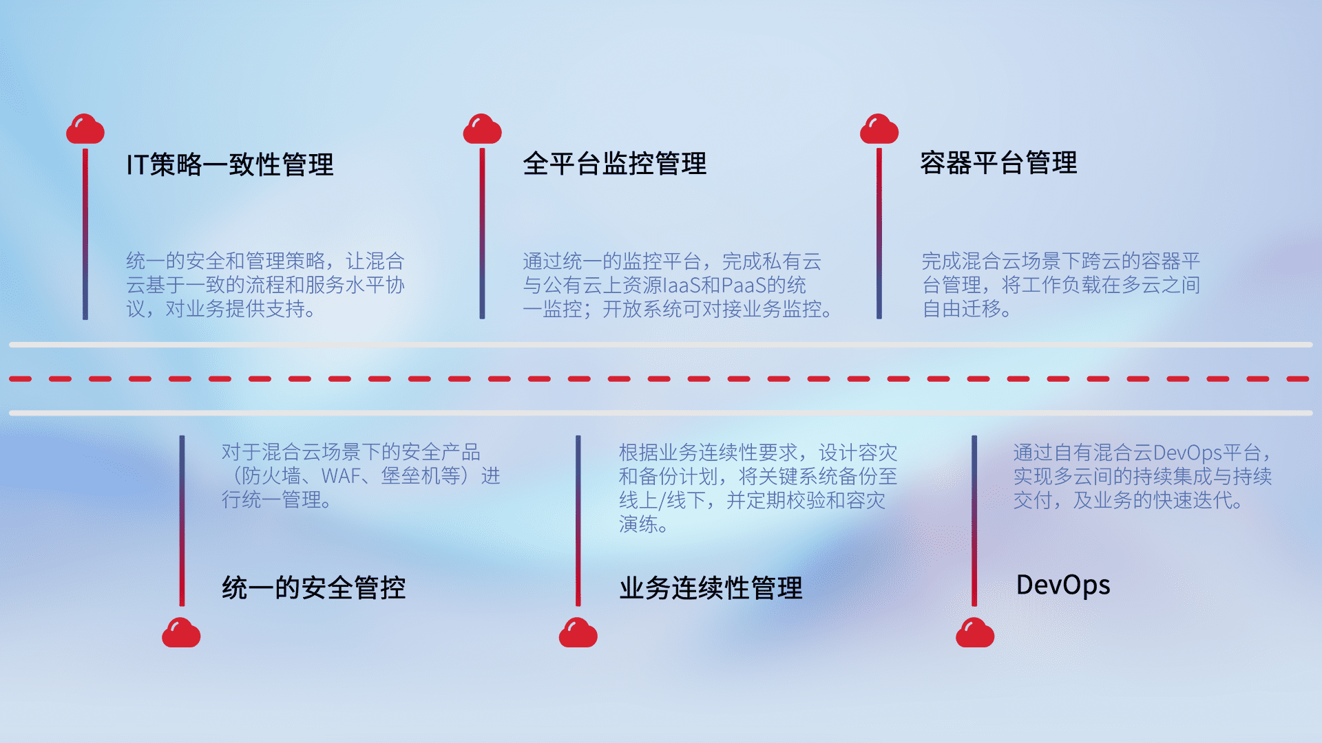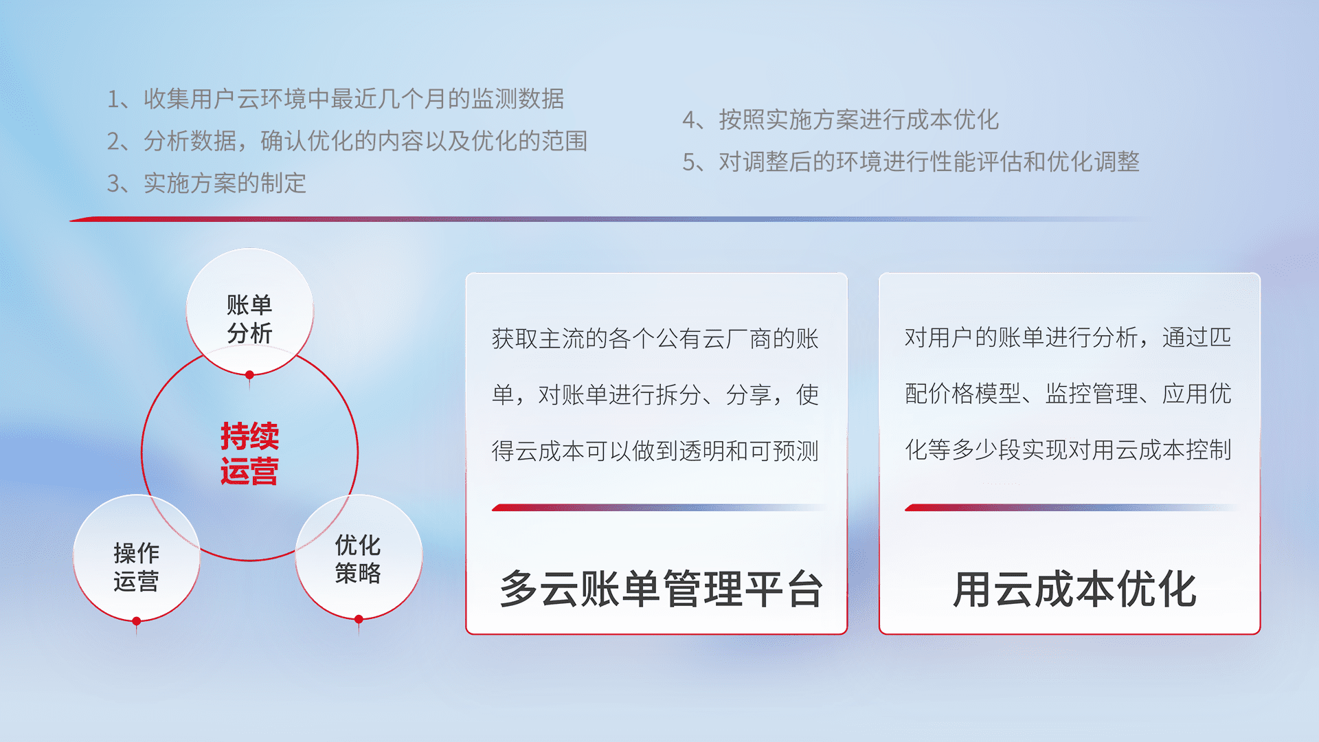通过多云纳管,,,,以统一的资源数据模型把客户的云资源进行抽象和封装,,,,进而实现对多云资源的统一操作,,,,保障云资源管理的可靠性、、稳定性与可用性。。。。量身定制化运维内容,,,配置、、、、开发运维、、、补丁管理、、、、备份、、监控、、认证和访问管理、、、审计和日常巡检等,,,,保障在用云过程中的可靠度,,,,稳定度以及高可用率。。。。